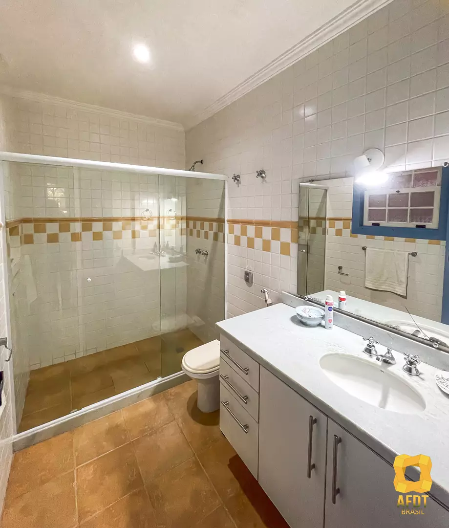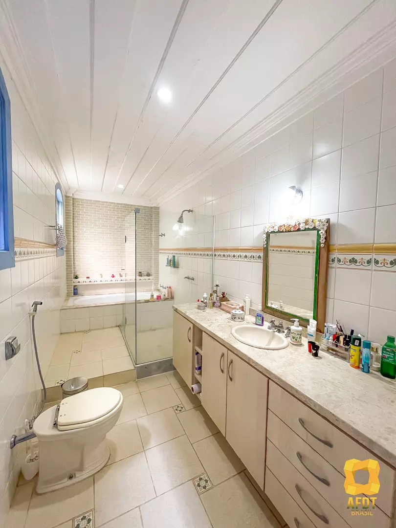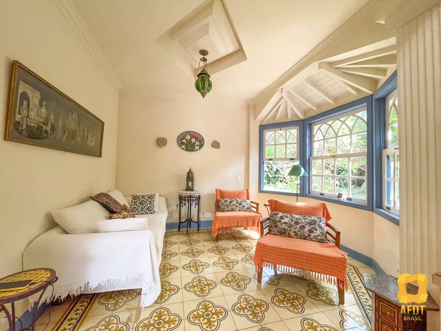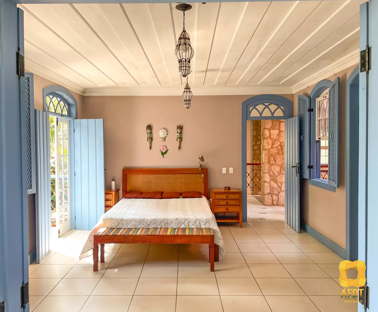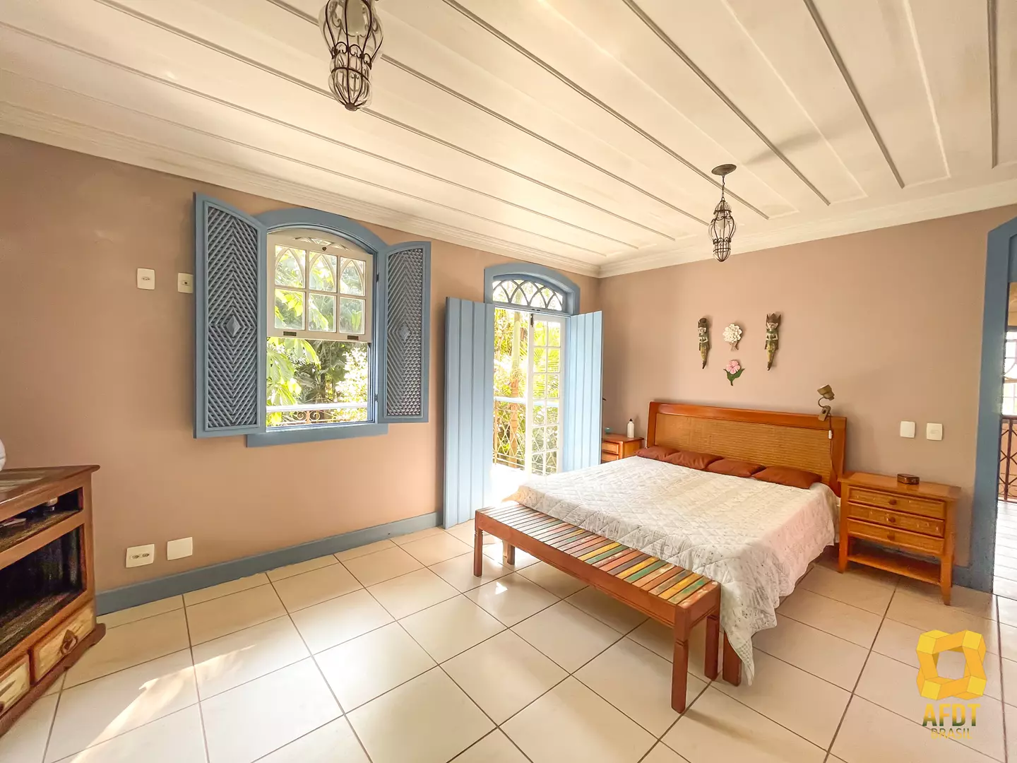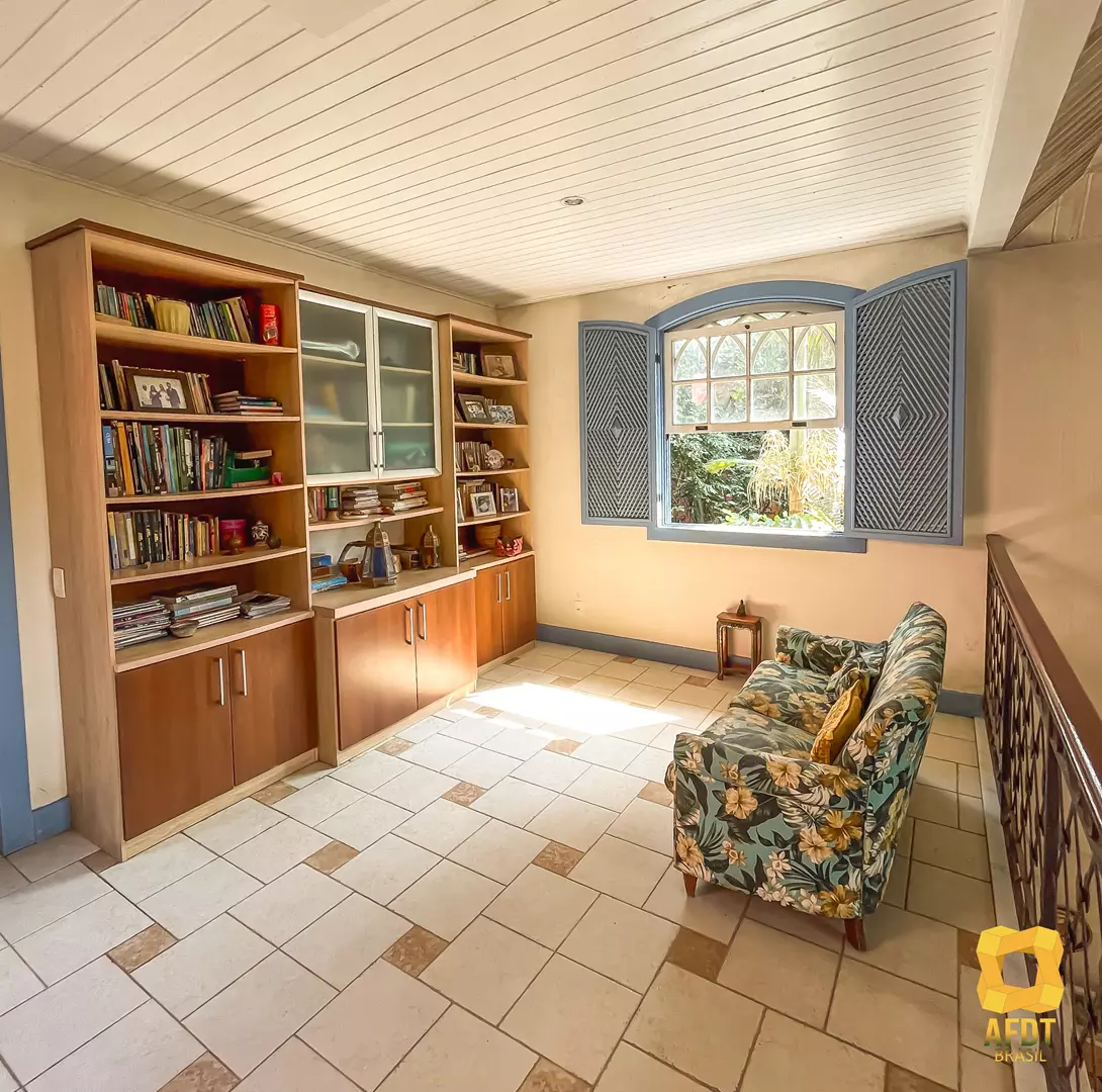 Casa tipo sobrado, 5 quartos (3 suítes), um escritório, varandas nas suítes do andar superior e no escritório, terraço na suíte master lounge com biblioteca, um lavabo, área de serviço, despensa, copa-cozinha, sala de estar, sala de jantar, sala de TV, jardim de inverno interno, hall de entrada, varanda frontal e nas laterais da casa, duas vagas de garagem, uma edícula tipo kit net (com cozinha, banheiro e varanda), jardim com árvores diversas